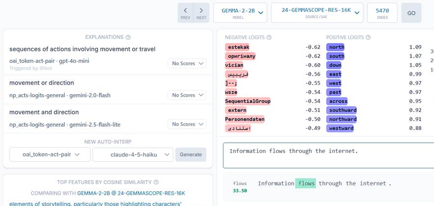 Kerroksessa 24 Gemini vinkkasi katsomaan myös Logit-kohtaa. Logitit ovat sanoja, joita malli ennustaa seuraavaksi sanaksi. Ominaisuuden 5470 aktivoituessa mallin logitit – eli ennusteet seuraavaksi sanaksi – alkavat painottaa ilmansuuntia: north, south, east, west. Tämä näyttää tapahtuvan jopa silloin, kun lauseen subjekti on abstrakti.