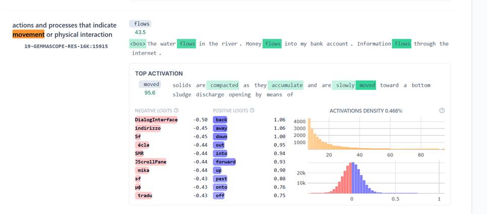 Lauseet ”Water flows” (35,25) ja ”Money flows” (36,25) aktivoivat tämän Featuren lähes samalla voimakkuudella; samoin ”Train travels” (29,00) ja ”Ideas travel” (28,13). Mallin tulkinta lienee lähinnä: ”Tässä liikkuu jotain, oli se sitten vettä tai valuuttaa, kulkuvälineitä tai informaatiota.”